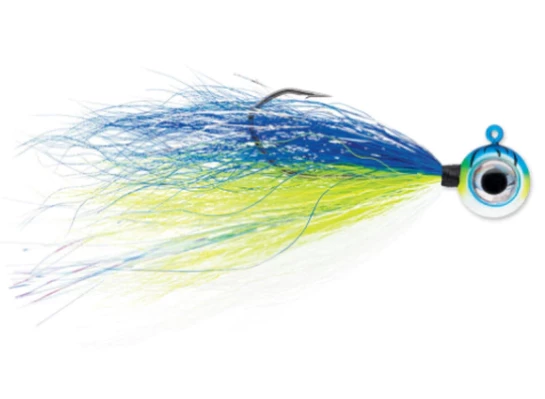 TechSet® technical locking curve maximizes hook sets and locks fish in place. Oversized flat aspirin head shape enhances darting and rolling head motion when jigged. Low profile elongated bucktail fibers maintain shape and creates life-like action. UV BRIGHT Finish reflects more light energy, strengthening the lure’s visibility.