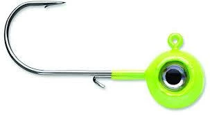 This VMC upgraded version of the traditional Aspirin-shaped heads provides added control. 3-D holographic eyes create the illusion of a wider profile while adding realism. Assembled with a VMC Premium high-carbon steel hook with top of the line black nickel finish. The wide range of colors includes UV Bright finish colors that guarantee you to catch more fish in all water conditions.